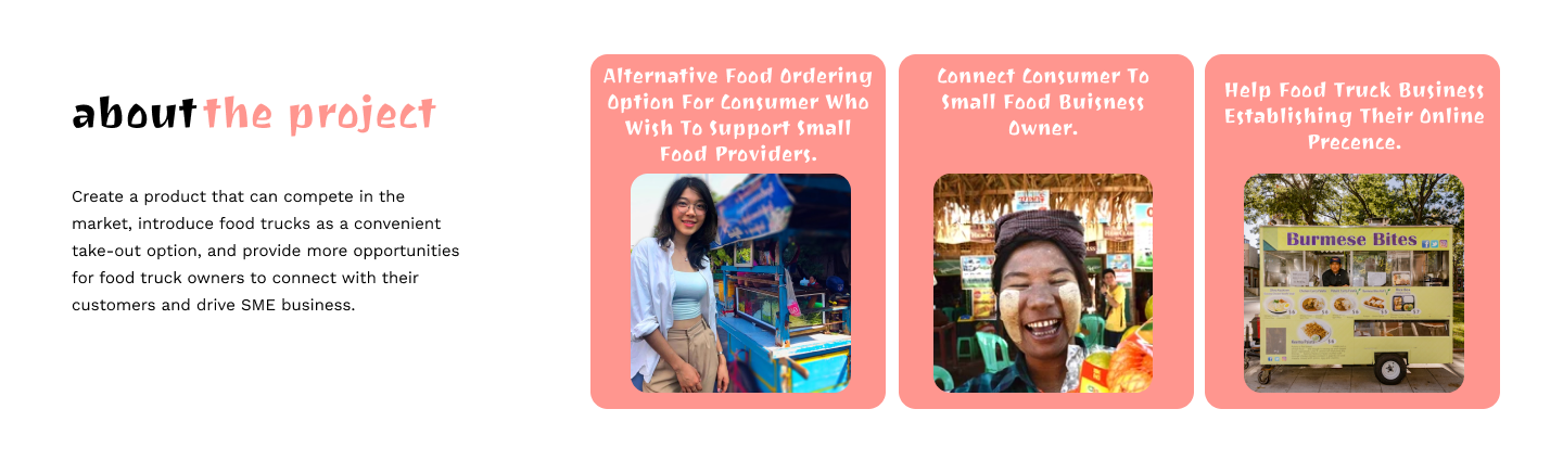 With covid, many small restaurant owners in Myanmar can no longer afford rents at their key locations or food court spaces due to constant closures of the malls, not to mention the overhead of workforce and miscellaneous bills. The Truck Fleet aims to serve small F&B owners a platform to have a cheaper running overhead and operate their food concepts. The app is part of this more significant business concept. In this project, we are designing a Food Truck app for Myanmar nationwide where it connects consumers directly to the person who is behind their food. Our competitors' food delivery services, such as Food Panda and YangonD2D in Yangon, do not cater to this niche audience yet in Myanmar.